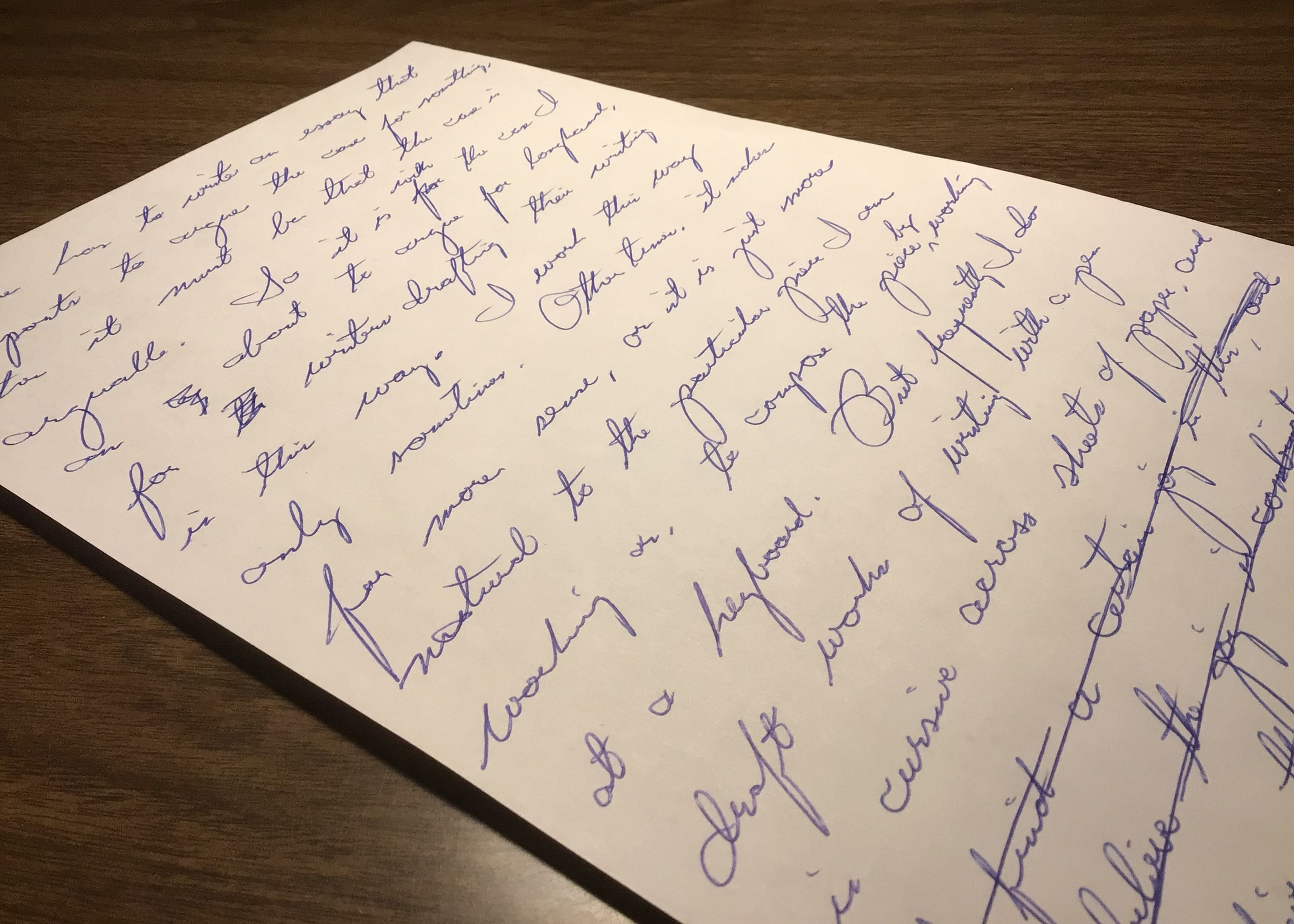 Yet frequently I do draft works of writing with a pen in cursive across sheets of paper, and there is a reason, a purpose for writing this way.